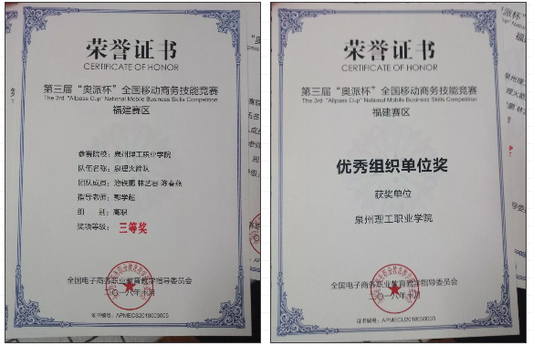 10月28日,第三届“奥派杯”全国移动商务技能竞赛福建赛区选拔赛在厦门落下帷幕。我院电子商务专业郭学超老师指导的“泉理火箭队”(17电商学生池轶鹏、陈春燕、林艺容)首次参加比赛,荣获三等奖、同时我院还获得优...