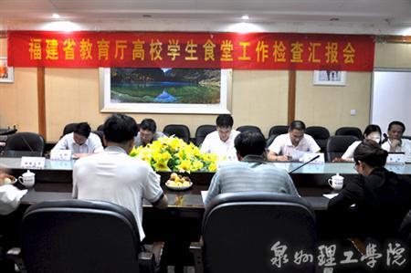 泉州理工学院庄文瑞副校长代表学校向检查组作了汇报。按教育部等五部委和福建省教育厅三部门的有关文件精神,学校为进一步做好学生食堂工作,先后召开了一系列食堂工作会议,并按照学生在籍人数安排专项资金设立学生食堂饭菜价格“平抑基金”。 “平抑基金”由泉州理工学院资助工作领导小组兼管。