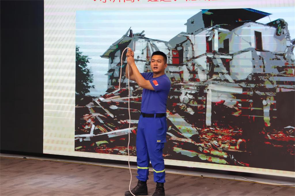 提问结束后,杜晓航向在座同学讲解地震逃生技能及地震知识普及。现场通过快速绳结打法及三角区躲避法向大家展示如果在遇到地震时最大限度的自救。