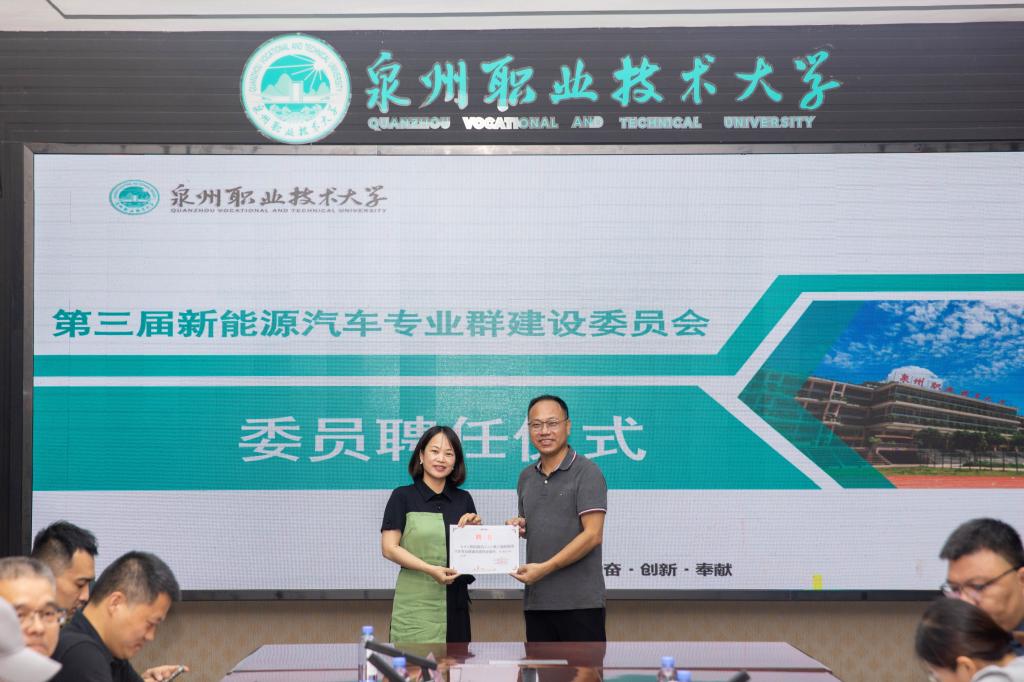 随后进行本次会议的第一项议程,为新聘任的新能源汽车专业群建设委员会主任、副主任以及委员颁发聘任书。