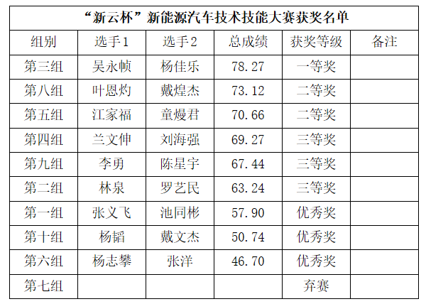 经过评分、统分、核对无误后,现场公布了本届新能源汽车技术技能大赛获奖名单。具体获奖名单如下: