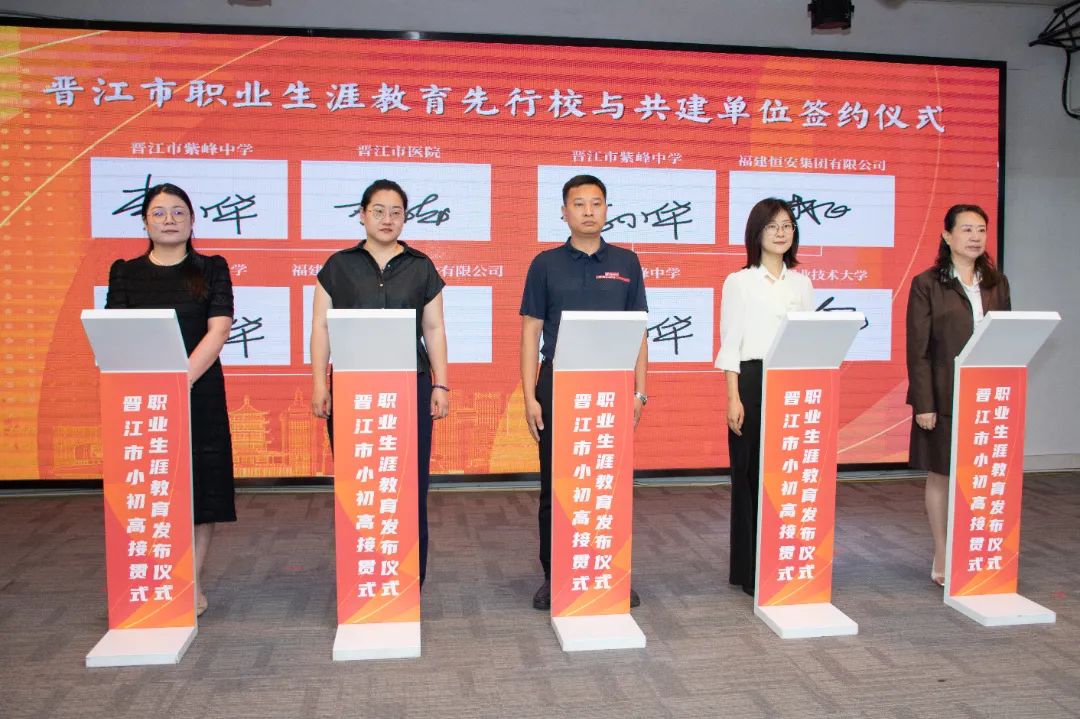 会上举行晋江市职业生涯教育先行校与共建单位的签约仪式。晋江市第二实验小学、晋江市首峰中学、泉州五中桥南校区、福建省晋江华侨职业中专学校等13所先行校与泉州职业技术大学、安踏(中国)有限公司、福建盼盼食品有限公司、福建恒安集团有限公司、福建省晋江华侨职业中专学校、晋江市晋兴职业中专学校等共建单位将携手并进,开展跨界融合,为职业生涯教育注入强劲动能,让教育从“单向输出”转向“共生共创”。