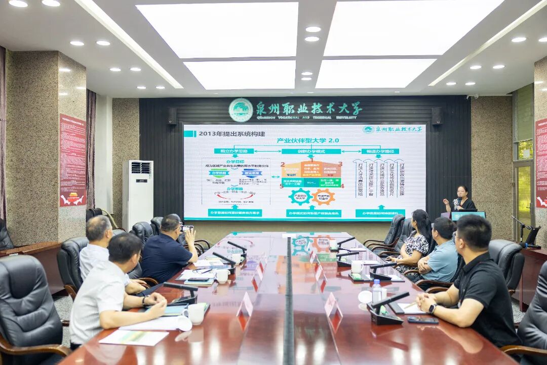 随后双方在第一会议室进行座谈交流。吴滨如代表学校对吴立春一行表示热烈欢迎,并从产教融合、社会服务、人才培养、职教出海等方面介绍了学校的创新做法与阶段成效。吴立春高度评价我校“产业伙伴型大学”的办学定位,认为学校把学生培养与产业需求深度耦合,校企合作既有深度更有广度,值得借鉴。两校同为首批职业本科试点院校,与会人员围绕现代职业教育体系建设、专业群内涵发展等议题深入研讨,气氛热烈。双方将继续携手在人才培养、专业建设及资源互通等方面开展务实合作,共同推动闽鲁职业教育事业迈上新台阶。