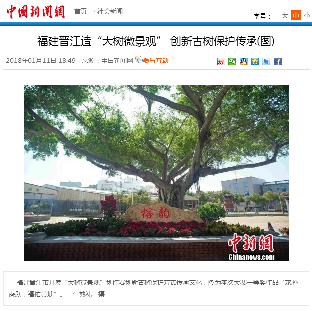经过普查和省级检查验收,晋江市共确定挂牌保护的古树名木共153株,此外,晋江一些村居社区还生长着相当数量的古树,这些古树名木资源是自然界和前人留下的宝贵财富,其历史渊源、文化底蕴、社会意义和科学价值深广。 内坑镇黄塘村村干部林荣枝感叹,他们村村委会面前一棵大榕树,树龄80年,胸径100,树高10米,占地面积250平方米,几天时间里,原本不起眼的一棵榕树,在创作团队成员手中被赋予了新的生命。“龙腾虎跃,福佑黄塘”,现在这个大树微景观,已成为村民休闲娱乐的好去处,人们发现,原来村里的古树这么美,村民们的爱树护绿意识空前提高。