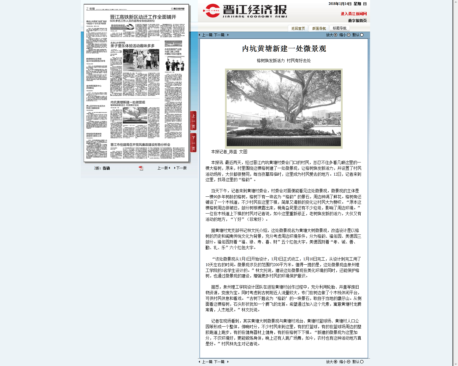 “该处微景观从1月1日开始设计,1月3日正式动工,1月10日完工,从设计到完工用了10天左右的时间。微景观涉及的范围约200平方米。值得一提的是,这处微景观由泉州理工学院的5名学生设计的。”林文托说,建设这处微景观在美化环境的同时,还能保护榕树,也通过微景观的建设,增强更多村民的环境保护意识。