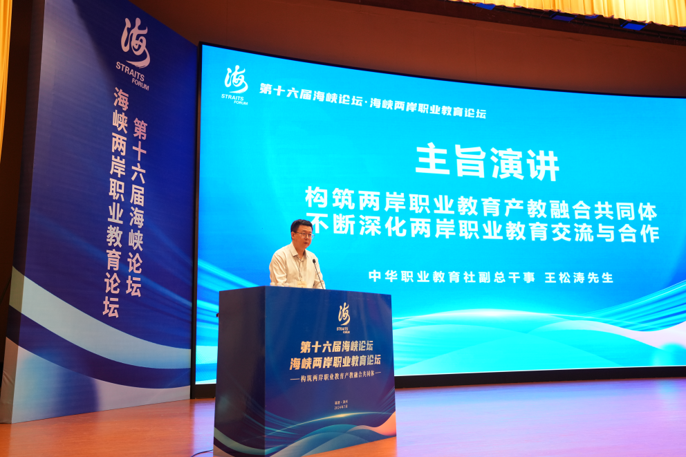 王松涛在主旨演讲中指出,构筑两岸职业教育产教融合共同体,既是发展新质生产力的需要,也是推动两岸同胞铸牢中华民族共同体意识的需要,有利于增进两岸民生福祉,共享中国式现代化的红利。构筑两岸职业教育产教融合共同体需要把系统协作、利益共享、融合发展、改革创新等新理念、新方法贯穿始终,通过多元主体参与和资源整合共享,推动两岸职业教育产教融合共同体产生实效。