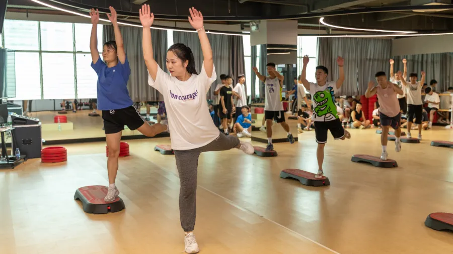赵雨洒老师带着学生们一起跳有氧踏板操