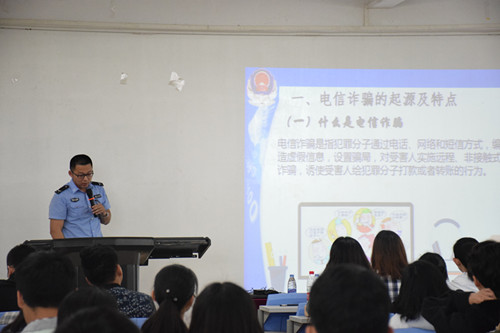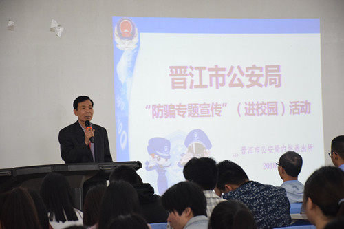 近几年来,校园诈骗案件频繁发生,为了更好加强同学们校园防盗防骗的技巧,提高同学们对于各种诈骗的识别能力,4月18日,商学院邀请到内坑派出所金牌讲师李海平警官、内坑派出所郑警官在238教室举行校园防盗防骗技巧的安全知识讲座。
